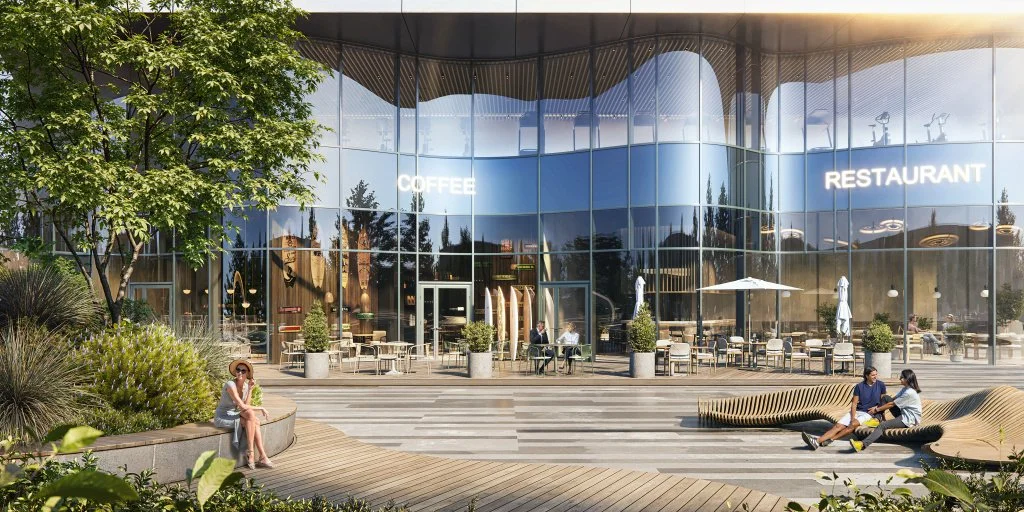 Помимо современных офисов класса А в проекте предусмотрено около 7 000 кв. метров коммерческих помещений: кафе и рестораны с верандами, столовая, ритейл и сервисы. Концепция «сухих ног», реализованная в стилобате, позволяет резидентам пользоваться всеми услугами, не выходя на улицу.