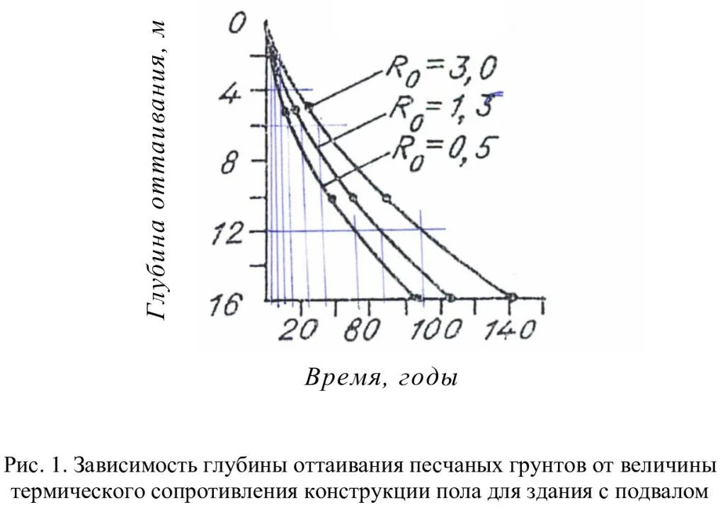 При увеличении Rо в три раза, с величины 0,5 до 1,5 кв. м•°С/Вт, время оттаивания до глубины 4 м увеличивалось ориентировочно в 2,5 раза, до 18 лет. Соответственно, при увеличении Rо в шесть раз (с 0,5 до 3,0 кв. м•°С/Вт) время оттаивания увеличится в пять раз и достигнет 37 лет. Расчетное время оттаивания вечномерзлых грунтов при Rо=3,0 кв. м•°С/Вт для здания с подвалом шириной 12 м (температура в подвале принималась до плюс 5°С) до глубины 4,0 м может достигать 37-40 лет, а до глубины 10 м — 80 лет.