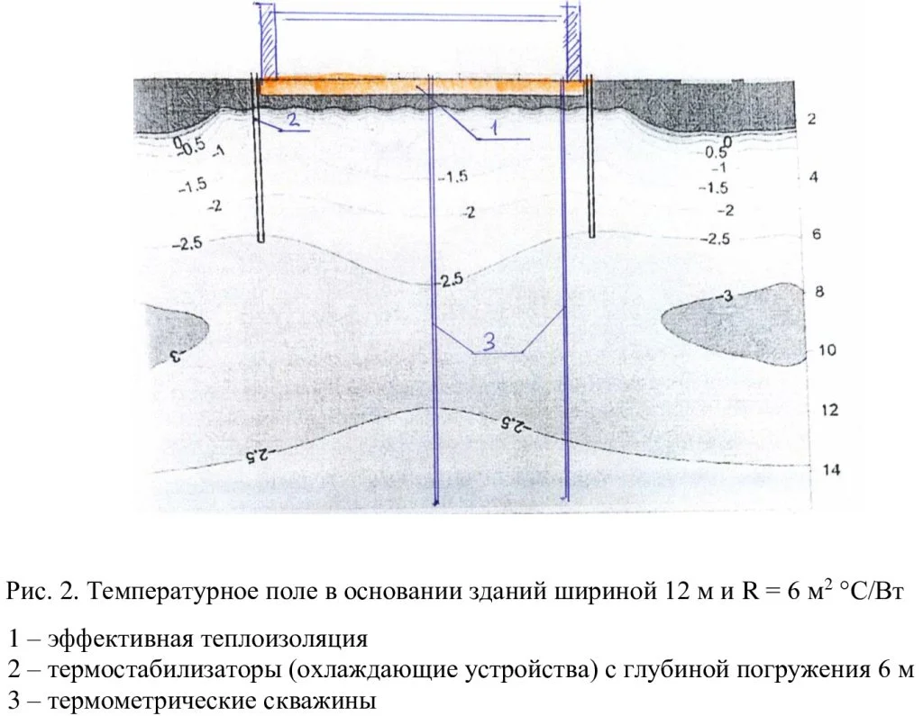 3. В третьем объекте выполнить аналогичные работы, но установить по периметру наружных стен вертикальные термостабилизаторы глубиной погружения до 8-10 м.
