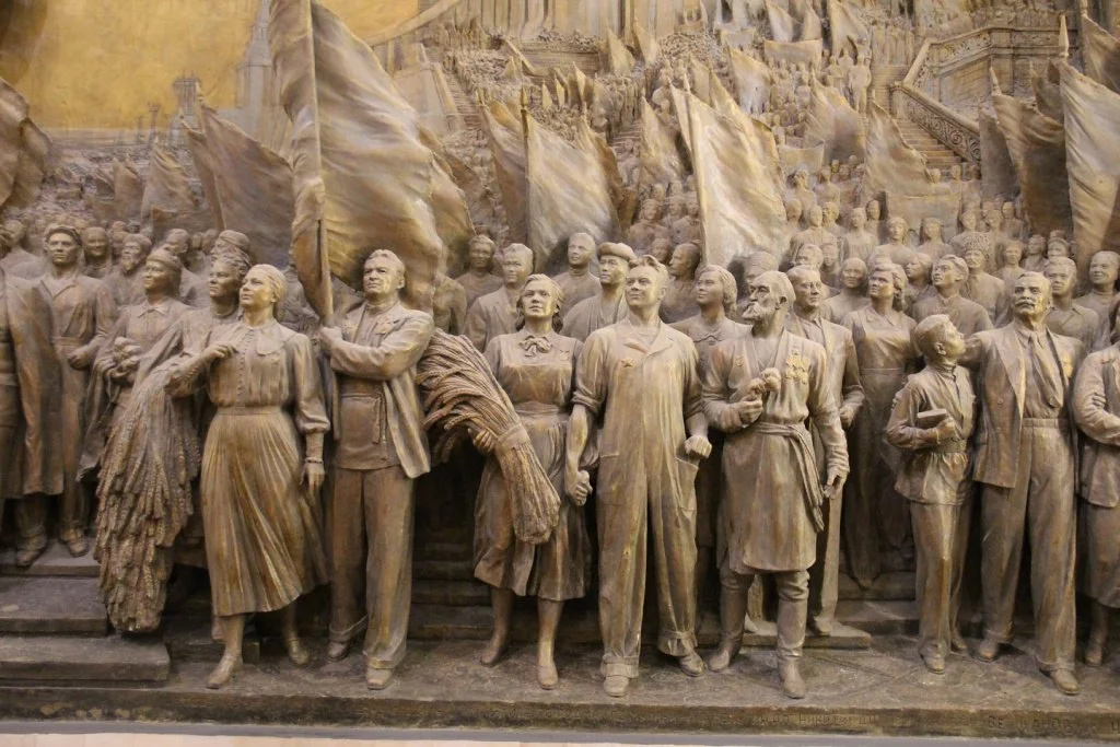 Особенно понравился нашей команде горельеф «Знаменосцу мира, советскому народу — слава!», созданный специально для павильона группой скульпторов во главе с Евгением Вучетичем, — вот он останется здесь навсегда. Интересна его история: это одна из самых значительных находок на ВДНХ последних лет. На горельефе площадью 90 кв. метров представлено торжественное шествие советских граждан разных национальностей, профессий и возрастов на фоне знаковых сооружений: высотки МГУ, плотины ГЭС и других — более 1,5 тыс. человек.